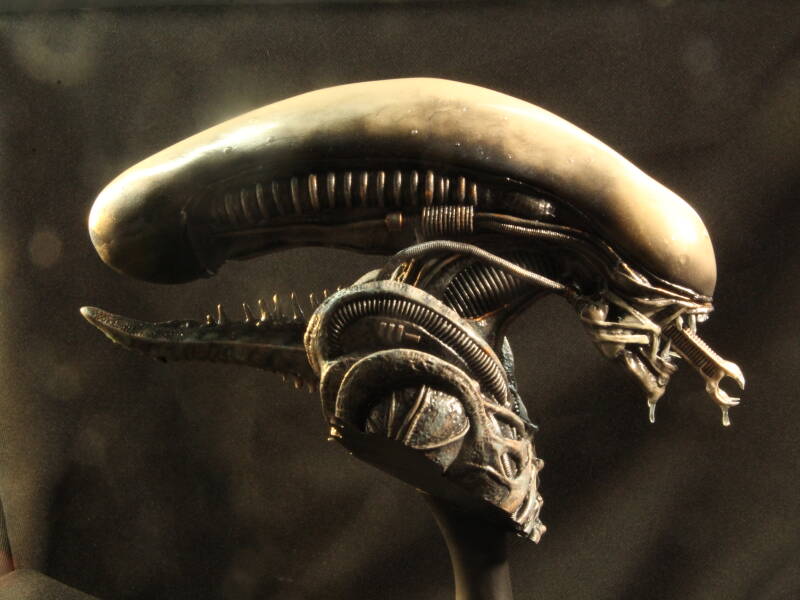 C'était mon challenge de cet été. Voici donc les photos de ce buste que j'ai peint à ma façon tout en gardant les codes originaux de la créature, Je l'ai voulu plus sombre, plus poisseux, comme couvert d'une huile noirâtre symbole de sa fin de cycle. Le dôme est transparent et laisse (légèrement) apparaitre le crane. Le buste est au 1/5 ème et mesure une vingtaine de cm de haut.