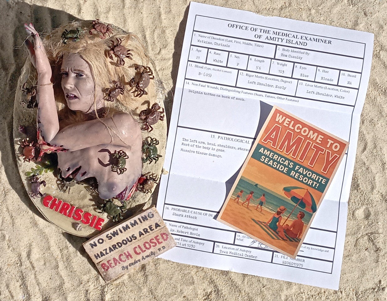 Chrissie, la première victime des dents de la mer. Un buste très gore et dérangeant réalisé d'après les descriptions du roman et du film JAWS- Les dents de la mer. Vous pouvez le découvrir en vidéo ici.